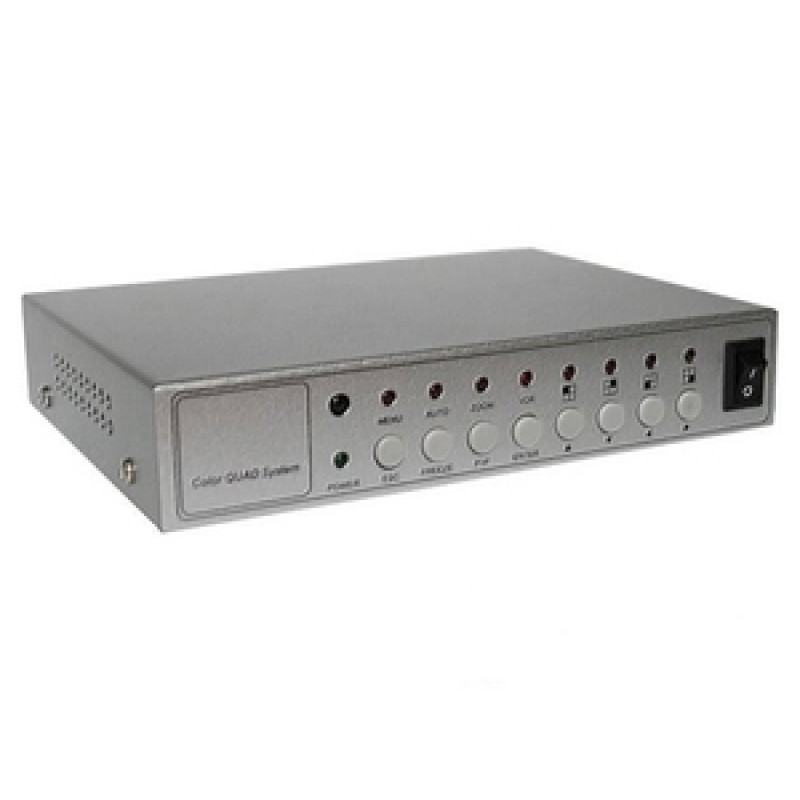Квадратор Цветной, 4 канала видео; BNC входы/выходы: VCR IN, VCR OUT, MONITOR OUT; разрешение - PAL: 704х576, 50 Гц, режимы отображения: полный экран / квадратор / PIP / режим автоматического переключения; в комплекте ПДУ, без БП, питание DC 12V/1A, 140x115x30 мм